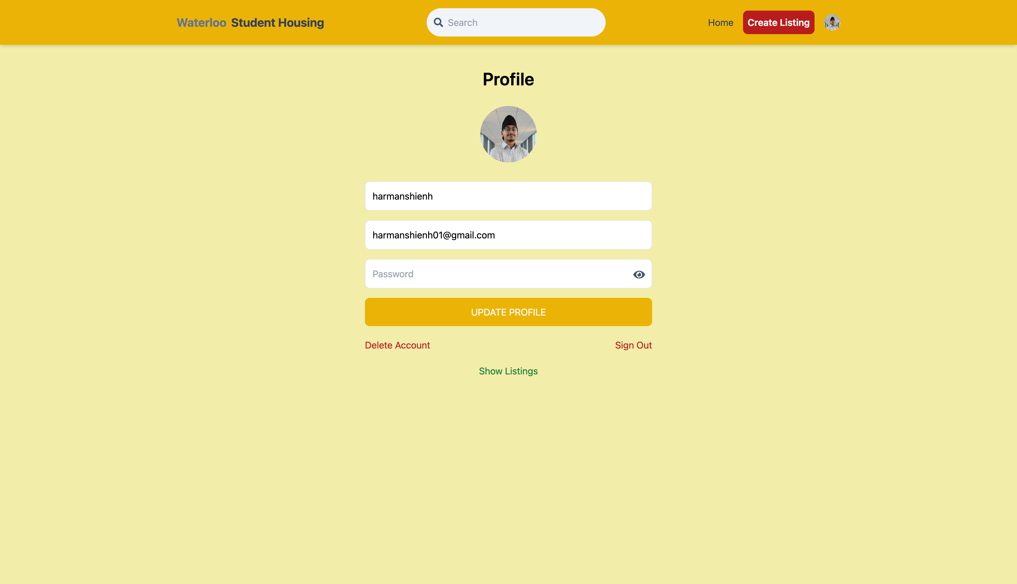Waterloo Student Housing is a marketplace for Waterloo students to find a home for the near future. I used React and TailwindCSS for the frontend. User verification for over 100 users was done using Node. User/Listing information was stored in a MongoDB database, which was retrieved using a REST API made with Node/Express. Firebase was used for Image storage and Google OAuth.